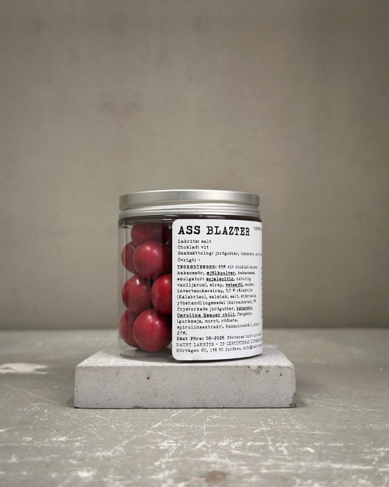 65 % hvit sjokolade (sukker, kakaosmør, MELKEPULVER, kakaomasse, emulgator: SOYALECITIN, naturlig vaniljearoma), sirup, HVETEMEL, sukker, invertsukkersirup, 3,5 % rå lakris (Calabria), salmiakk, salt, stjerneanis, overflatebehandlingsmiddel (karnaubavoks), 5 % frysetørkede jordbær, habanero, Carolina Reaper, fargestoffer (gurkemeie, gulrot, rødbete, spirulinaekstrakt). Kakaoinnhold: minimum 27 %.