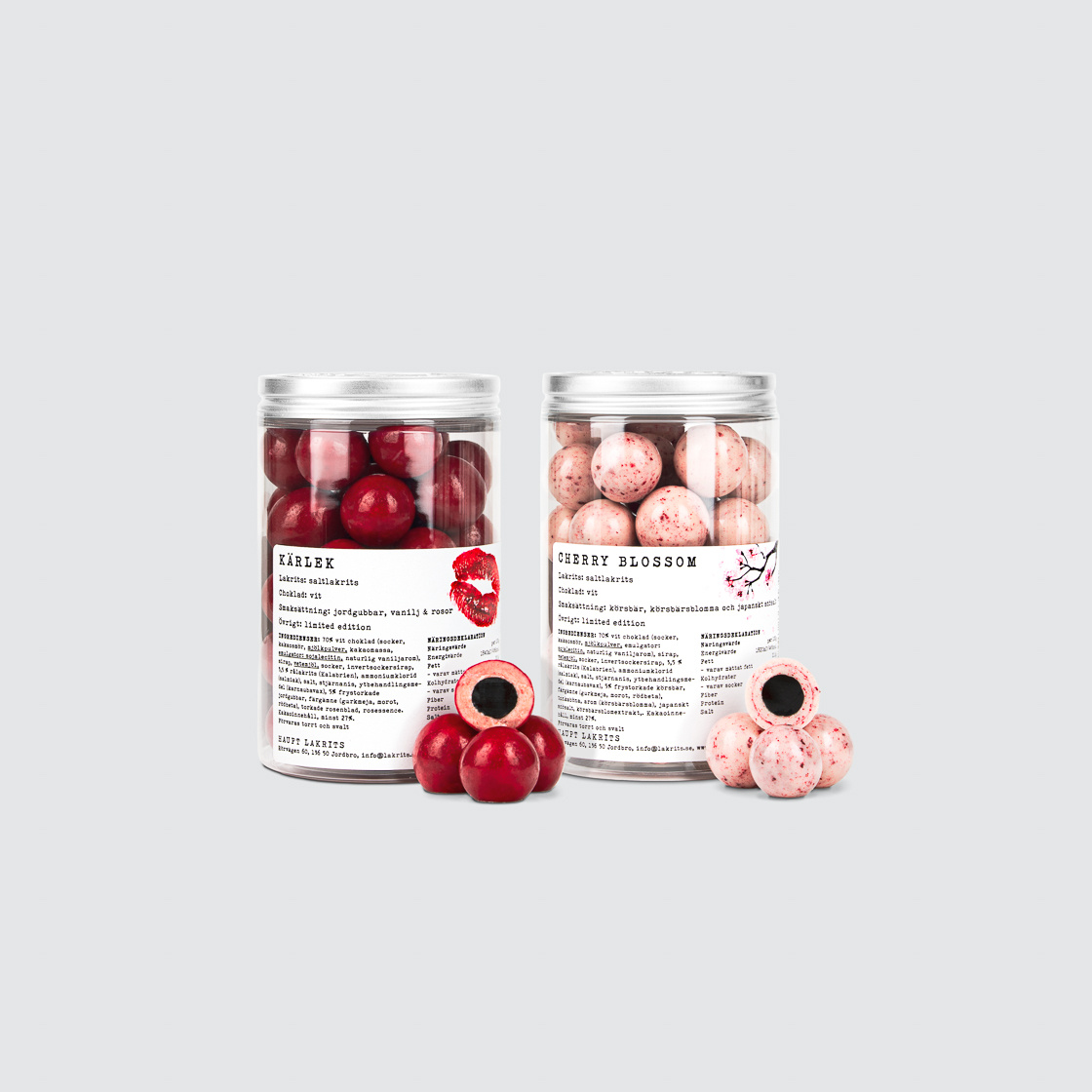 Kärlek (250 g) – langtidskokt saltlakris møter hvit sjokolade, jordbær, vanilje og roser. Søtt, salt og fullstendig uimotståelig. En flørt som blir værende.