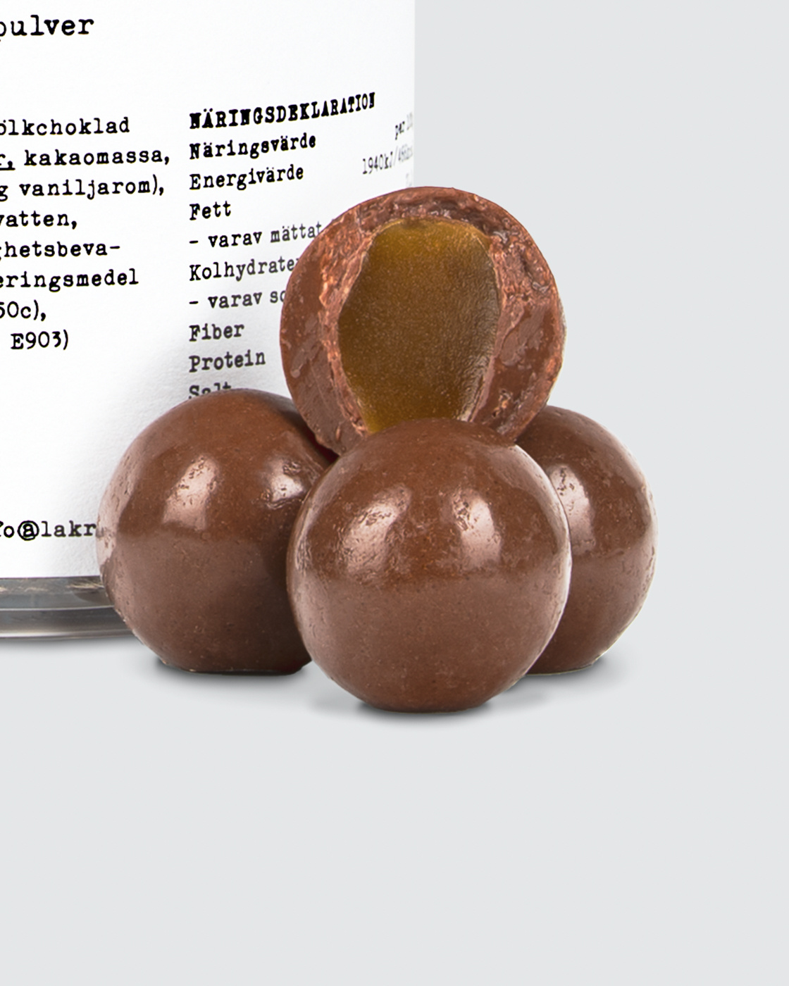 En karamellsøt kjerne overtrukket med belgisk melkesjokolade med salmiakkpulver.